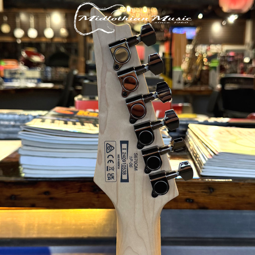 The Ibanez S670QM solidbody electric guitar combines aggressive, wide-ranging tone with undeniably sweet looks, for a shred-ready guitar you'll be proud to take on stage.