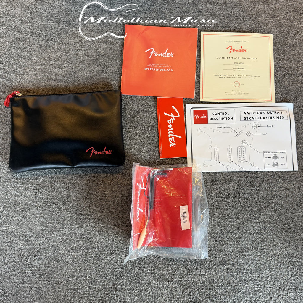 You also get a host of high-performance hardware appointments, including Fender’s 2-point American Ultra Synchronized tremolo, a cold-rolled steel trem block, Fender deluxe locking tuners, and a stylish 1-ply aluminum pickguard. Cutting-edge and classic all at once, the American Ultra II Stratocaster HSS elevates Fender’s time-tested S-style formula to bold new heights.