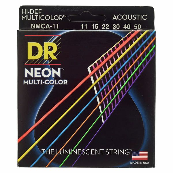 Midlothian Music values the importance of quality in craftsmanship, which is one of the many reasons why we are proud to be an Authorized DR Strings Dealer. This item is new.DR - NMCA-11 - 6-String Acoustic Guitar Strings - Hi-Def Multi-Color Neon (1 Pack)