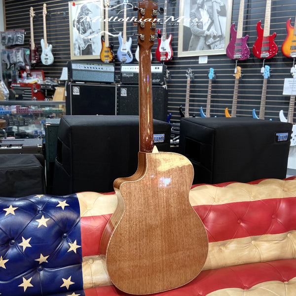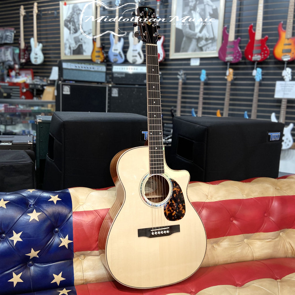 The cutaway OM body shape and size provides a well rounded, even frequency response. It features a Sitka Spruce top paired with Central American Mahogany for the sides, back and neck.