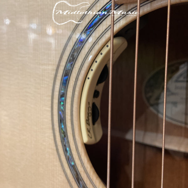 Ebony is used for the bridge and maple-bound fingerboard. Extra features include a tortoise pickguard and an Abalone soundhole ring, plus a Larrivee palm tree logo on the headstock. This guitar is equipped with LR Baggs Anthem pickup system, controls are located in the soundhole for a clean and sophisticated look.