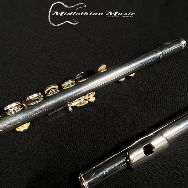 This Jupiter JFL507 student/intermediate silver plated closed hole flute is shown in excellent condition with normal wear and no dings or dents for a used instrument. The pads, corks and plating is very good. The factory molded hardshell case is included and all latches, handle and hinges work perfectly! Flute cleaning rod also included!